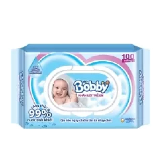 Khăn ướt Bobby(100 tờ) dịu nhẹ ngay cả với làn da nhạy cảm.