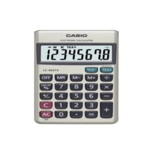 - Máy tính Casio LC 403TV chính hãng có bề mặt kim loại bền, có nhóm lệnh chức năng. Chức năng nổi trội: tính tỷ lệ phần trăm, tính thuế, đổi tỷ giá.