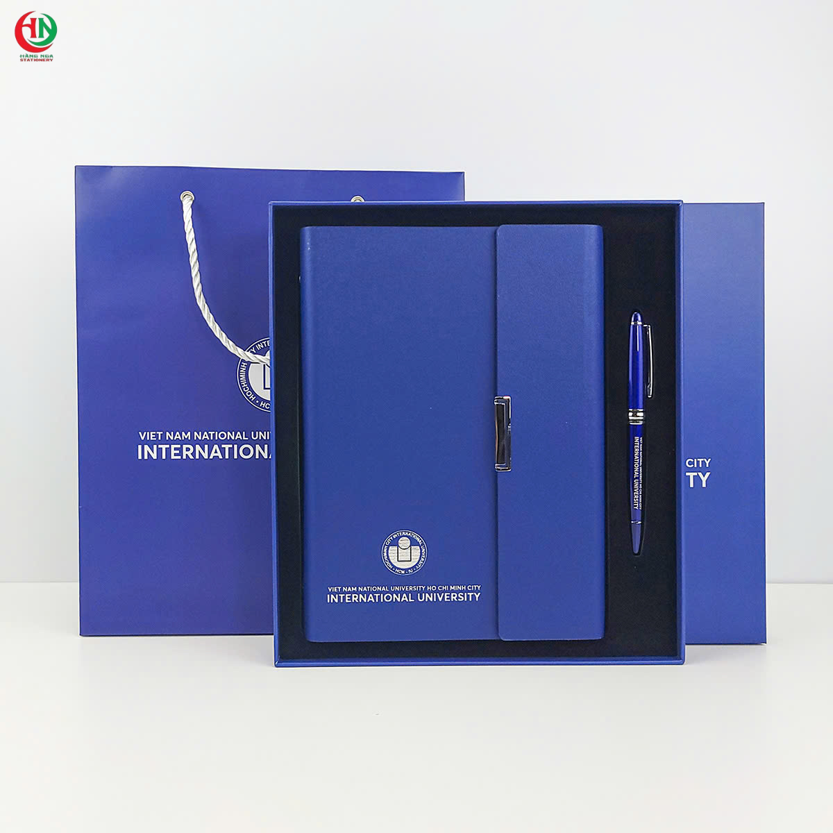 Bộ Sổ và Bút In Logo: Sổ tay da cao cấp, bút ký kim loại hoặc bút bi in logo công ty.