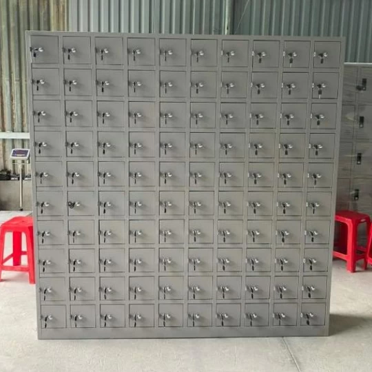 Tủ sắt sơn tĩnh điện 100 ngăn cánh mở. Trên mỗi cánh có 1 khóa Locker, núm tay nắm và tai khóa móc.