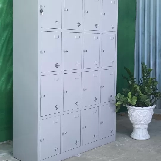 • Tủ sắt sơn tĩnh điện 16 khoang cánh mở. Trên mỗi cánh có 1 khóa Locker, núm tay nắm và tai khóa móc.