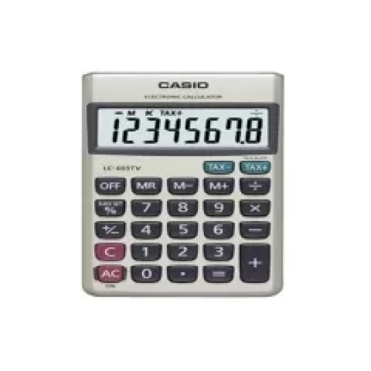 - Máy tính Casio LC 403TV chính hãng có bề mặt kim loại bền, có nhóm lệnh chức năng. Chức năng nổi trội: tính tỷ lệ phần trăm, tính thuế, đổi tỷ giá.