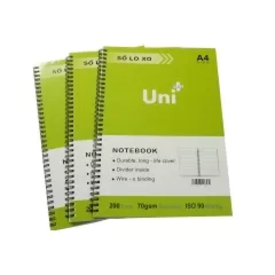 - Là sản phẩm sổ tập thương hiệu Uni Plus dạng ghi chú khổ A4, giấy kẻ ngang trắng đẹp ĐL 70gsm, dày 200 trang có lò xo bên mép trái thuận tiện cho việc ghi chép hoặc xé rời các trang cần thiết phục vụ cho công việc văn phòng.