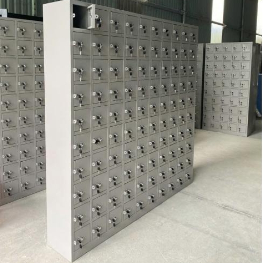 Tủ sắt sơn tĩnh điện 64 ngăn cánh mở. Trên mỗi cánh có 1 khóa Locker, núm tay nắm và tai khóa móc.