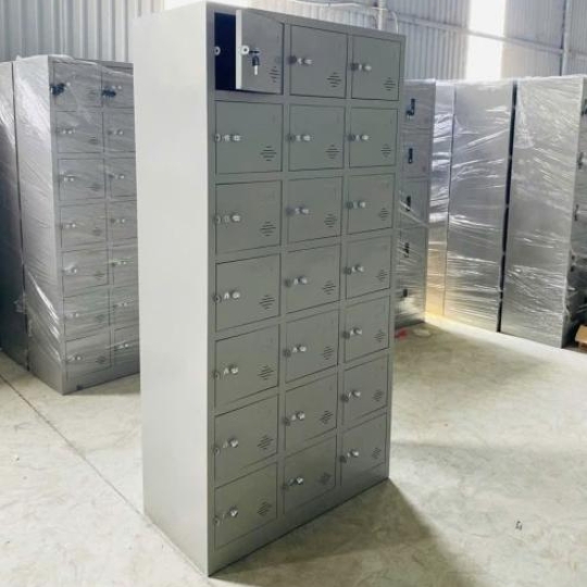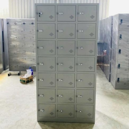 • Tủ sắt sơn tĩnh điện 21 khoang cánh mở. Trên mỗi cánh có 1 khóa Locker, núm tay nắm và tai khóa móc.