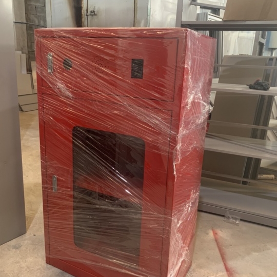 + Bên trong chia làm 03 ngăn: ngăn trên 200 mm gồm để chuông báo cháy, đèn báo, ngăn dưới để cuộn vòi lăng phun, có 01 giá vòi xoay có thể xoay 1 góc 90 độ với tủ để dễ dàng sử dụng, ngăn cuối để 03 bình khí CO2