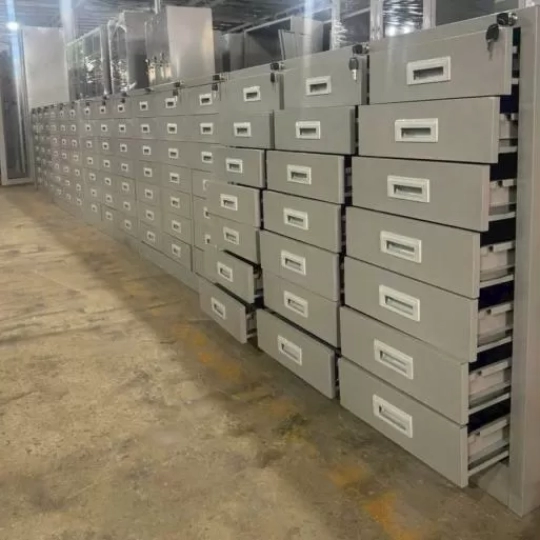 Tủ sắt sơn tĩnh điện gồm 21 ngăn kéo chuyển động bằng cơ cấu ray thép uốn. Các ngăn kéo dùng chung 1 thanh khóa dàn