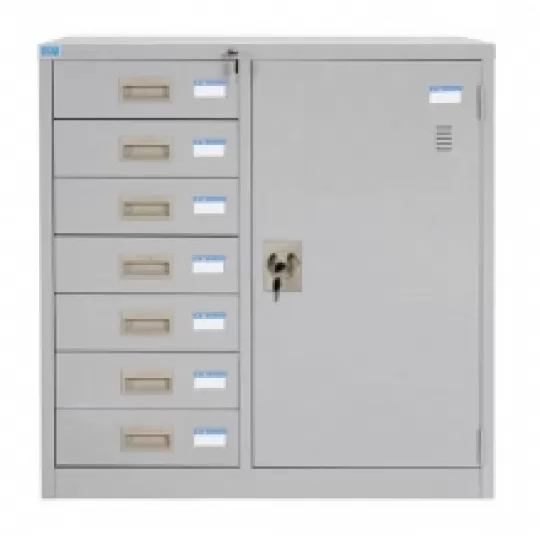 Tủ sắt sơn tĩnh điện 2 khoang: Khoang cánh sắt mở bên trong có 2 đợt di động. Khoang 7 ngăn kéo sử dụng chung một thanh khóa dàn.